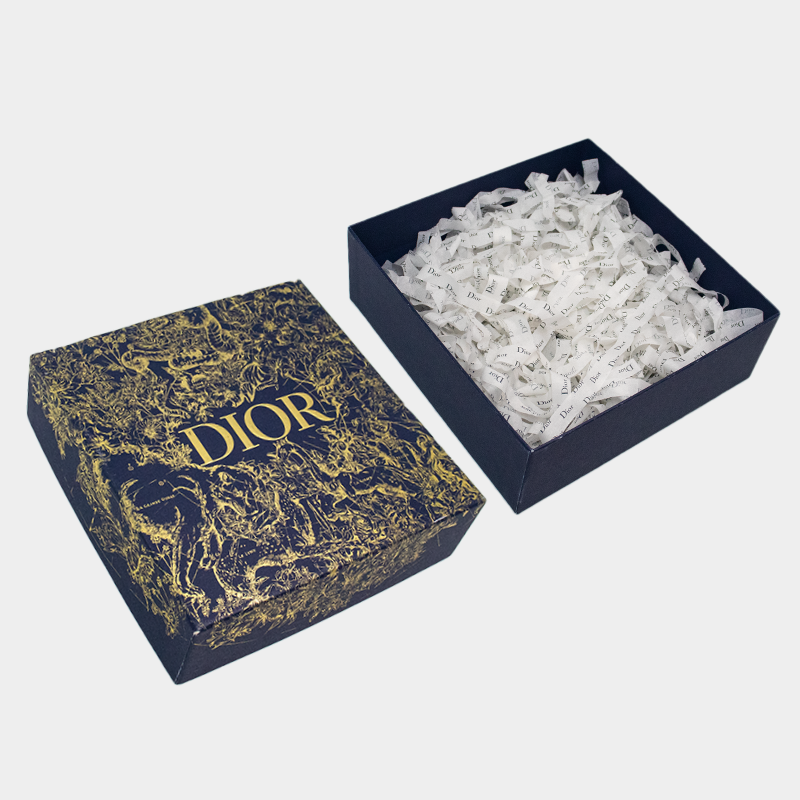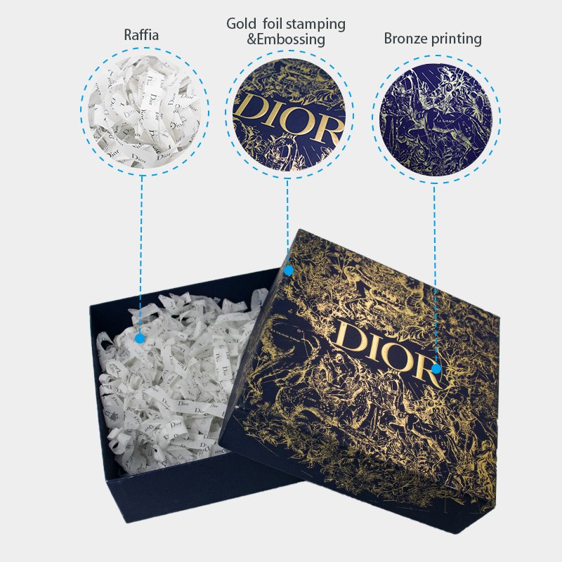 - Dior gift box : The use of raffia inner tray enhances the exquisiteness of the gift box. The white raffia with the logo not only highlights the product, but also strengthens the brand impression, reflecting the brand’s attention to detail and quality.