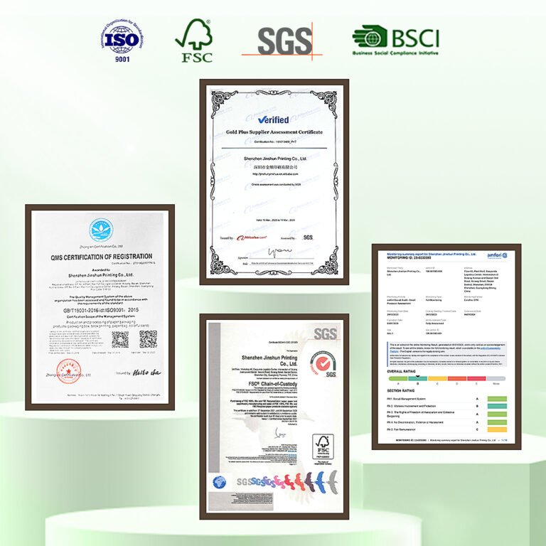 A factory must adhere to strict packaging regulations ; non-compliance can result in fines, cargo delays, or even market bans, the costs of which far exceed the packaging’s own expense. High-quality, cost-effective packaging requires compliance with regional regulations. JS Packaging holds ISO, FSC, SGS, and BSCI certifications, meeting the packaging requirements of most countries.