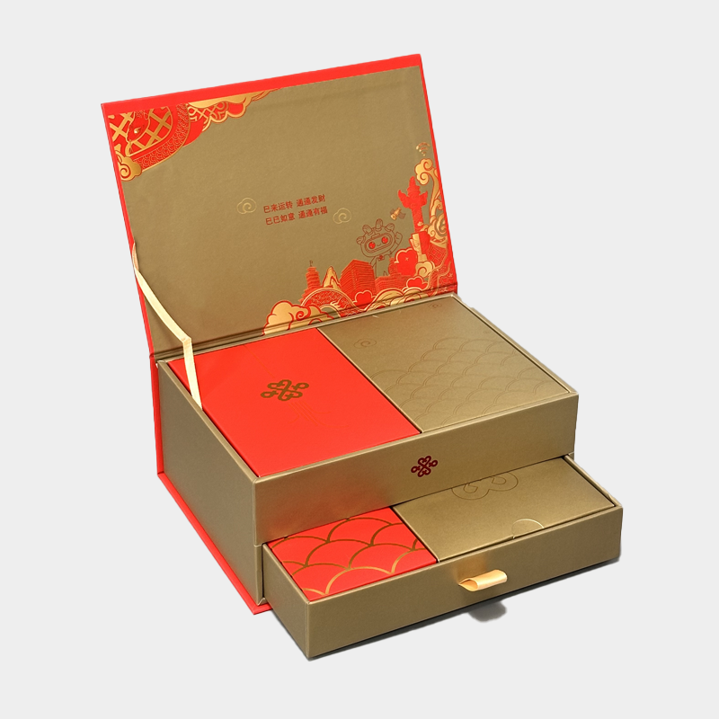 This is a New Year gift box customized for China Unicom, a well-known Chinese company. The multi-layered design combines a drawer box and a book-shaped box, allowing for the categorization of different gifts . The red and gold design is festive and bright, and the New Year patterns printed on the surface are clear and exquisite. When the customer saw the sample, he kept praising the high color reproduction and the tight design that did not waste any packaging space .