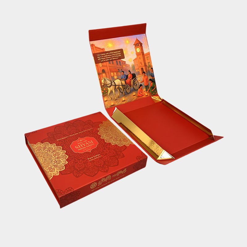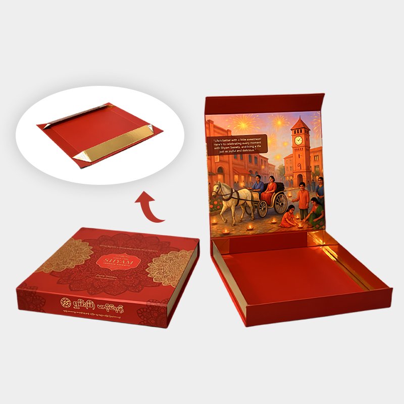 The price of this double-door hard box is higher than that of a double-door card box because it’s made of thicker, 1200g + 157g coated paper, making it more sturdy and giving it a more upscale look. The full-page UV printing process further enhances its luxurious appearance, and the inner tray can be customized to your product’s dimensions, materials, and structure. This gift box is suitable for businesses with high-value products, ample budgets, and a focus on packaging quality.