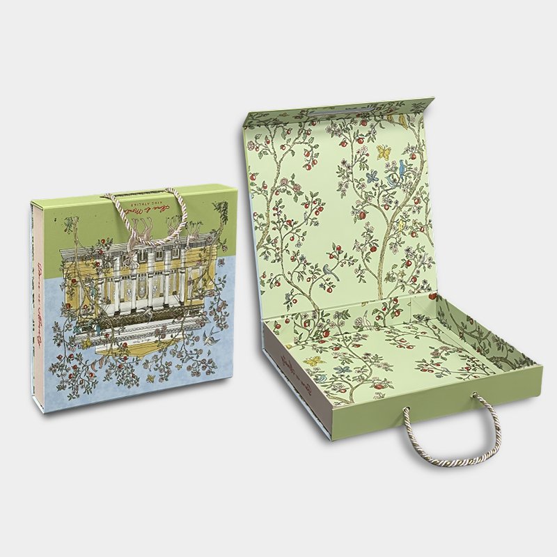 This packaging uses FSC-certified cardboard and five-strand rope , with four-color printing presenting exquisite patterns that have attracted many buyers; the four-corner adhesive design enhances structural stability and makes assembly easy; the three-strand hemp rope handle is comfortable to hold and has good load-bearing capacity, giving it a retro feel; the folding design saves storage and transportation space and costs, and is suitable for clothing , scarves , bedding , etc.