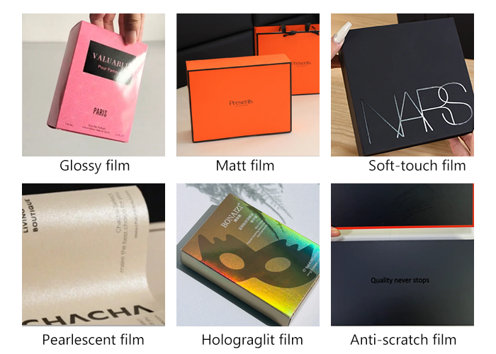 Bright film | High gloss, enhanced color vividness | Brightly colored gift boxes |
