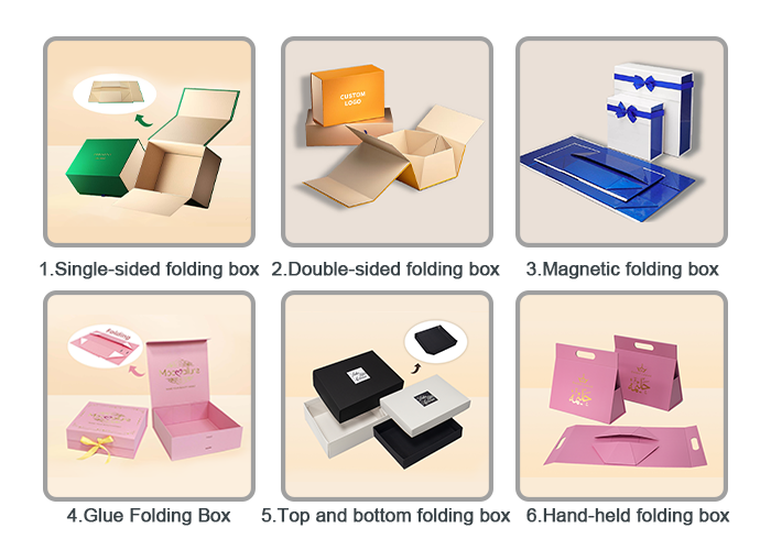 • Folding boxes – low transportation and warehousing costs. A variety of box styles are available, such as book-shaped folding boxes, double-door folding boxes, hinged-top folding boxes, and triangular-handled folding boxes. Sizes, craftsmanship, and inner trays can all be customized, suitable for customers in the beauty, luxury, and apparel industries. They can be folded completely flat, with a single box thickness of only 1mm. 100 folding boxes can be transported flat using only one standard cardboard box, saving 60% on logistics costs ; 2000 boxes can be stored in 1 cubic meter of warehouse space, saving 75% on storage rent , making them especially suitable for cross-border customers stockpiling goods.